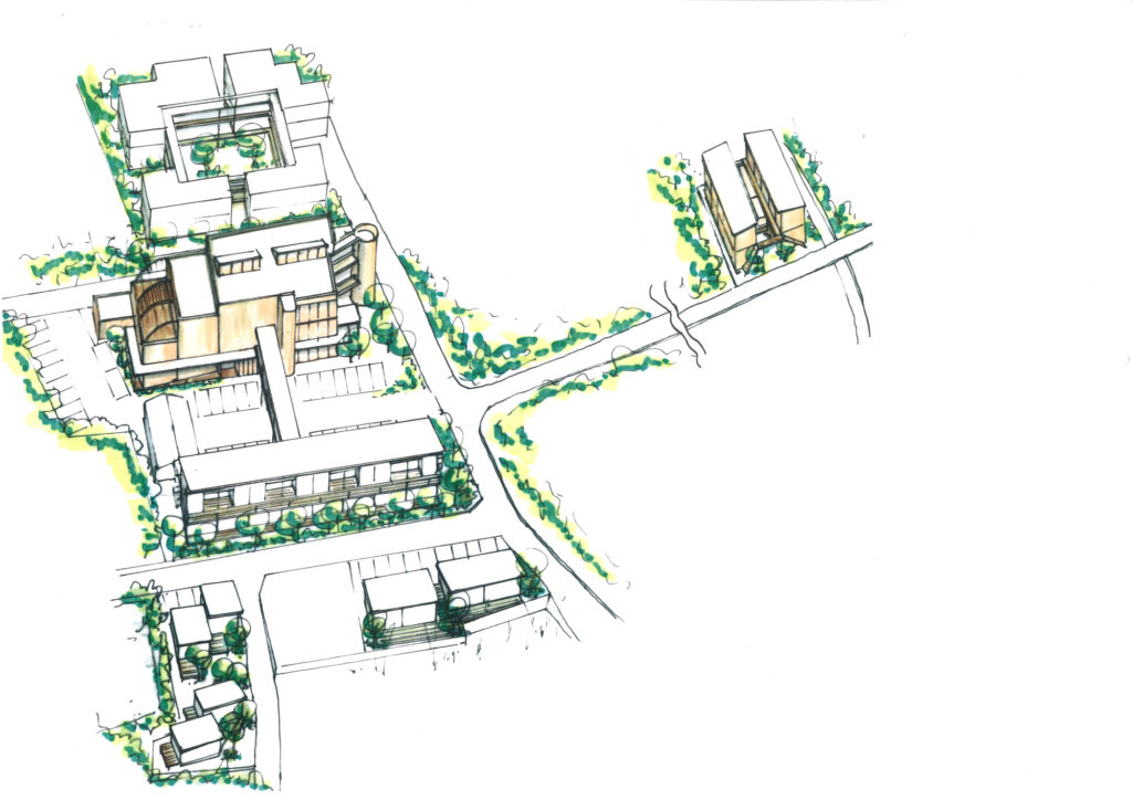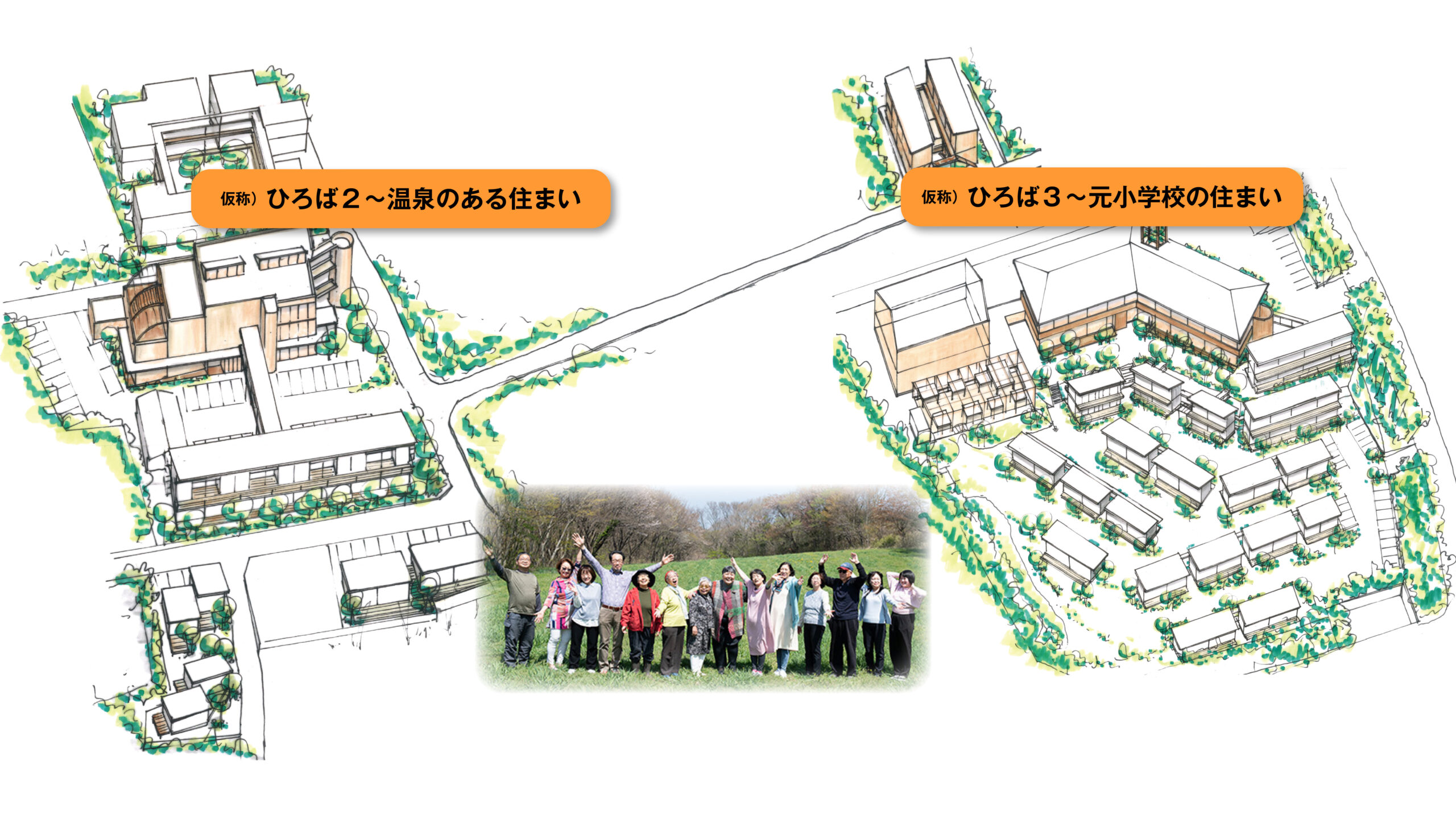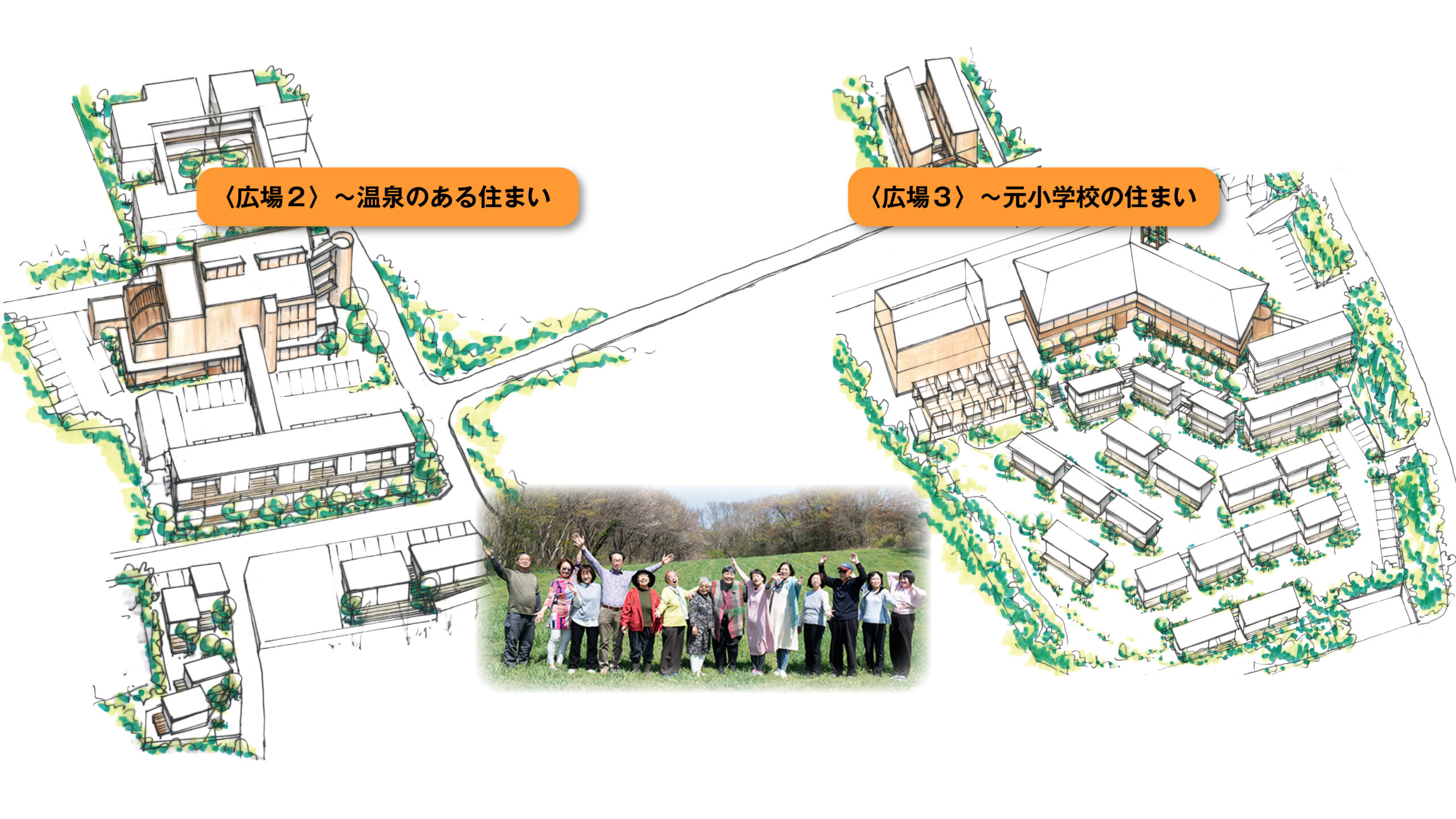 新しいサ高住宅と賃貸住宅旧温泉施設と小学校校舎を再生・転用