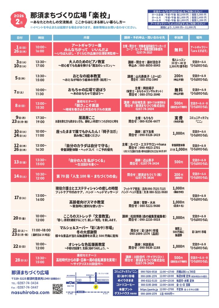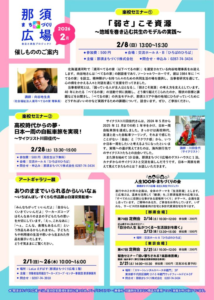 | 楽校セミナー ”「弱さ」こそ資源”” | 日付:2/8(日) | 時間:13:00~15:30 | 講師:向谷地生良 (社会福祉法人浦河べてるの家 理事長) | 申込:0287-74-3434 | 参加費:500 円 | 場所:那須まちづくり広場 交流ホールA | 詳細(備考):地域を巻き込む共生のモデルの実践 |