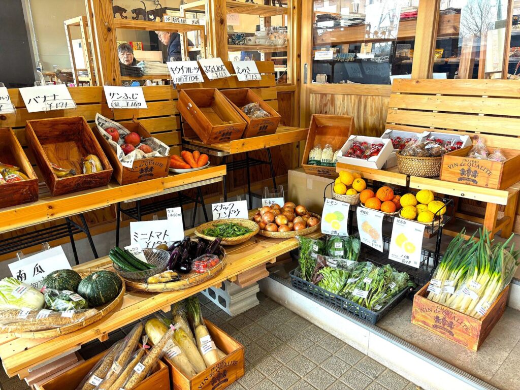 新鮮野菜と自然食品をメインに、那須のお土産、地元産品、天然素材の下着類、リサイクル品、お酒(2026年5月~販売開始予定)などを取り揃えています。地域の方はじめ那須を訪れる方々の憩いの場となっています。